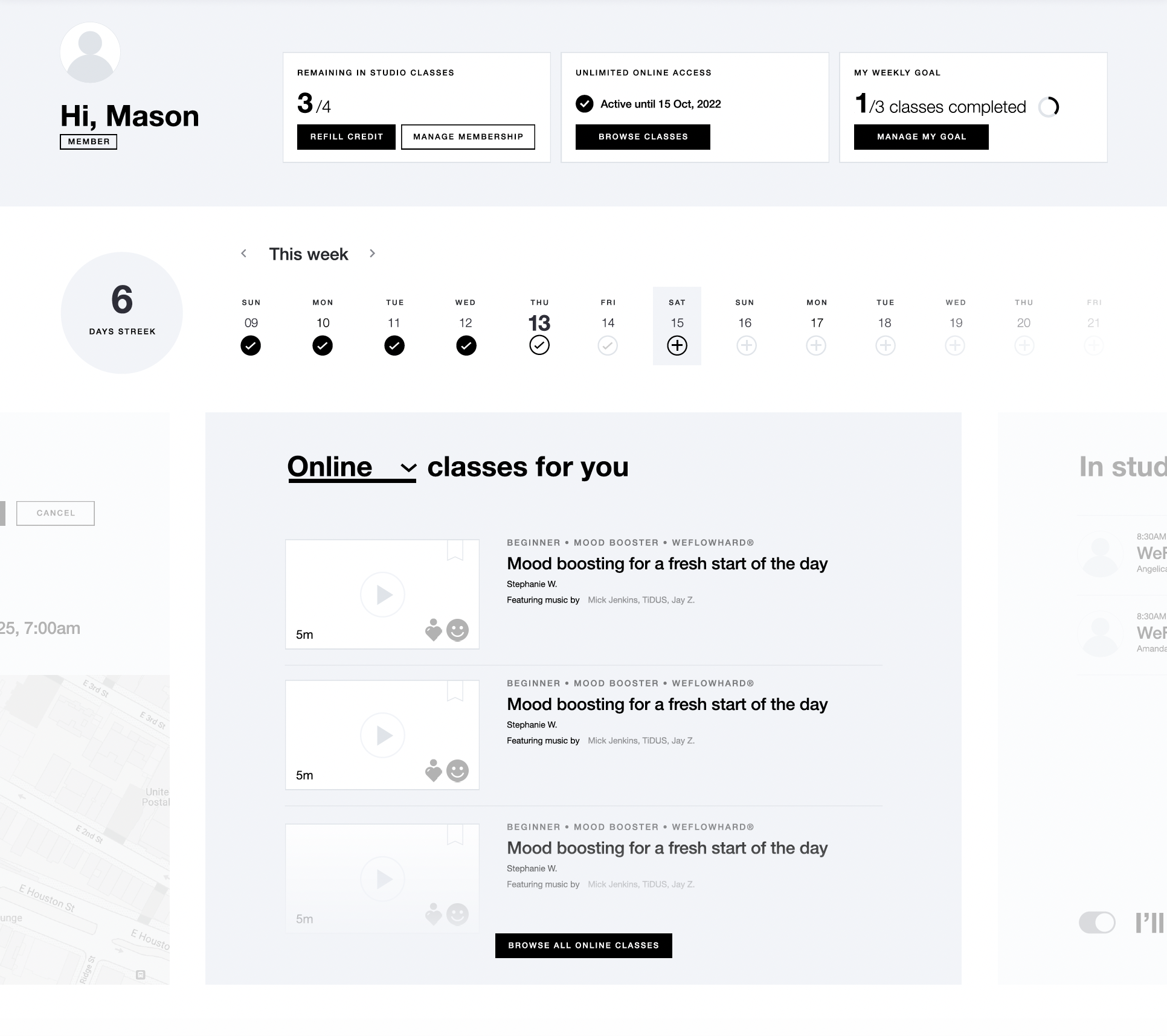 To reduce friction further, this dashboard also served as a hub to rapidly reserve a studio class or start a class in under three clicks.  To gamify the experience, they'd be also able to see how many total classes they've taken with the brand (both IRL and at-home).