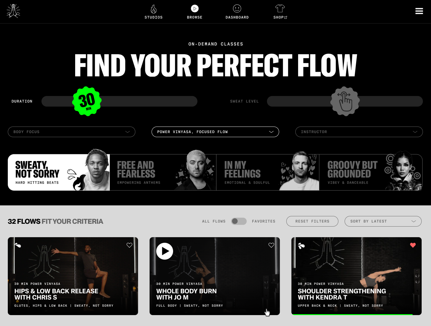 Competitor Obé’s browse page set a benchmark: powerful faceted navigation that filtered a clean grid of content that surfaced relevant class context.