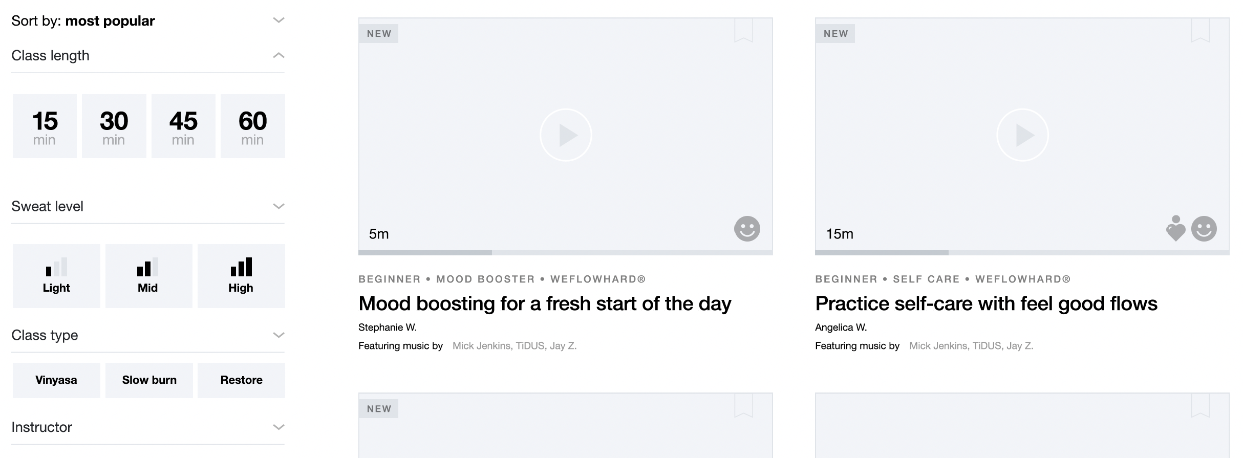 • No faceted navigation → users couldn’t combine duration, instructor, intensity, or body focus filter.
